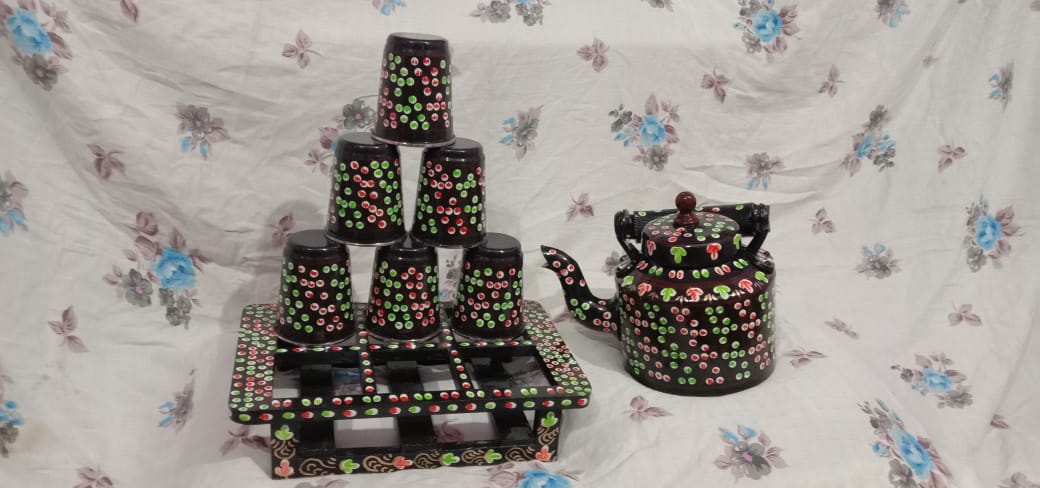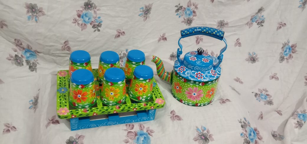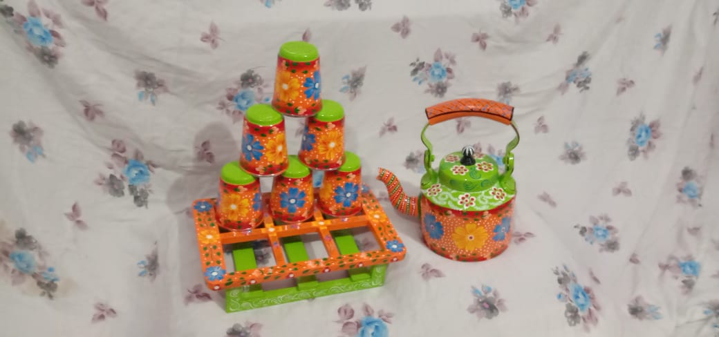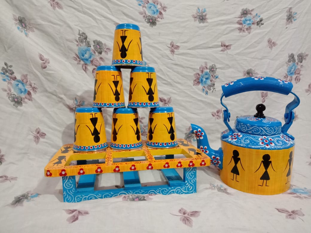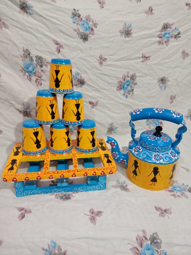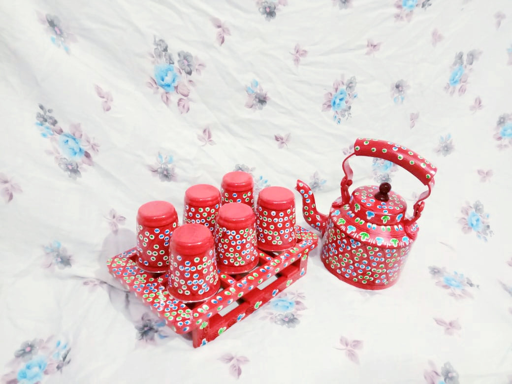 Bring home a touch of design fun with this bright and colourful Ketli set (Tea Kettle with 6 steel glasses and comes with wooden stand) with beautifully handpainted Indian patterns.
