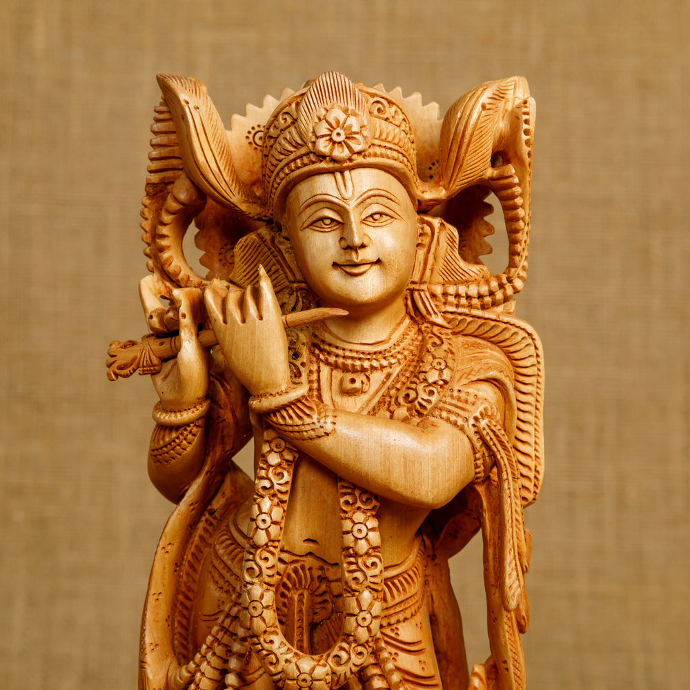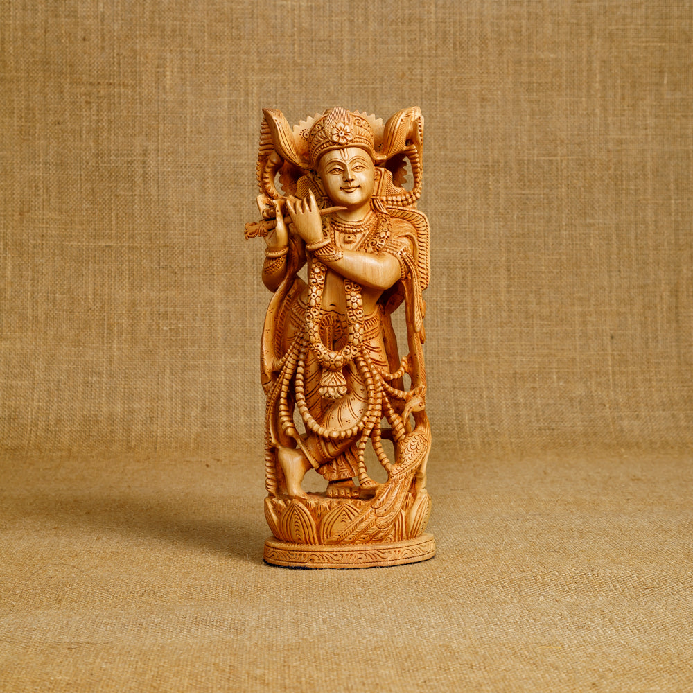 Lord Krishna's elegant sculpture is handcrafted in shivani wood, with intricate details carved beautifully. Lord Krishna is shown holding his murali in his hands, as he is also known as Muralidhar or Murari.