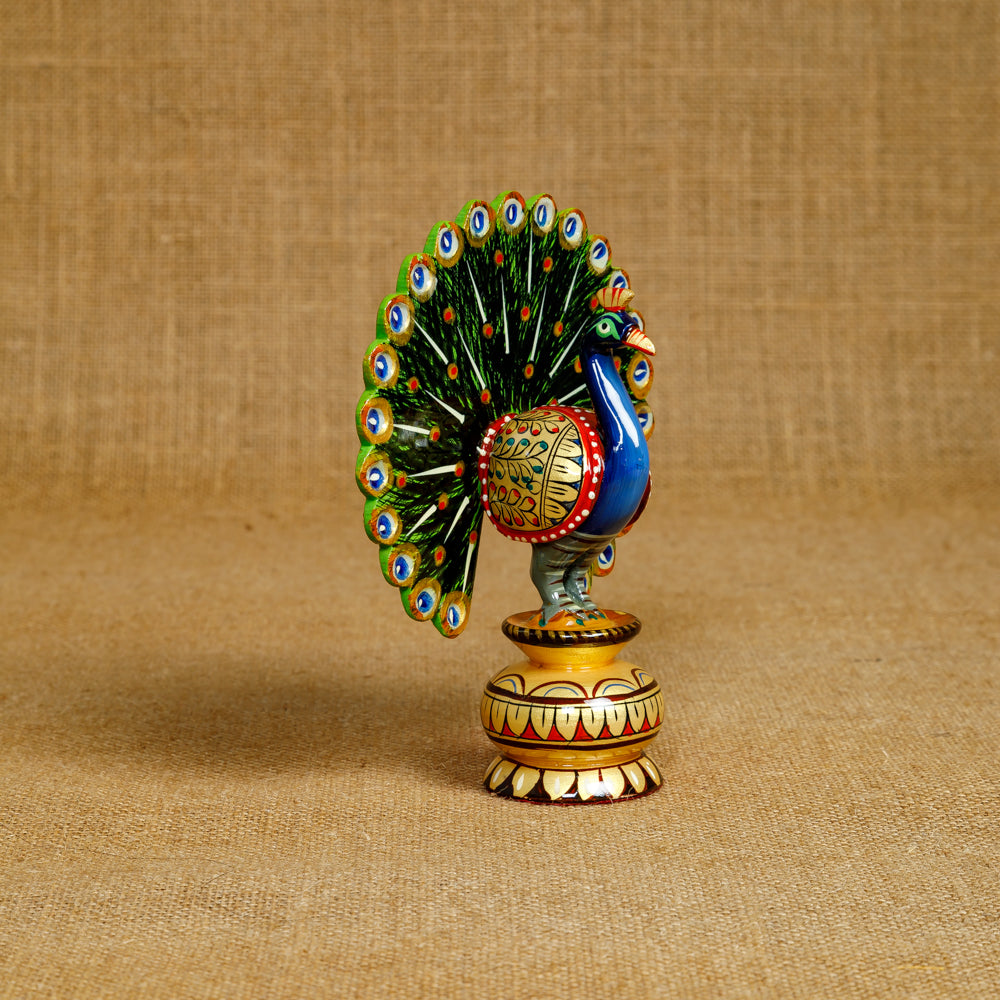 This majestic looking Peacock is carved out of wood and painted by hand. Peacock the National bird of India is shown and depicted by the artists in this figurine in all its glory by spreading his tail and displaying his colorful plumage.