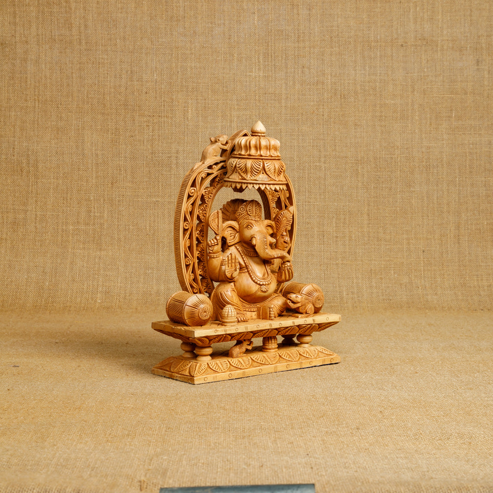 This elegant Ganapati idol is delicately carved out of shivani wood. The intricate wood carvings with the Lord Ganesha seated under the Umbrella, reflects the splendor & grandeur of Indian Traditional handmade wooden Art.